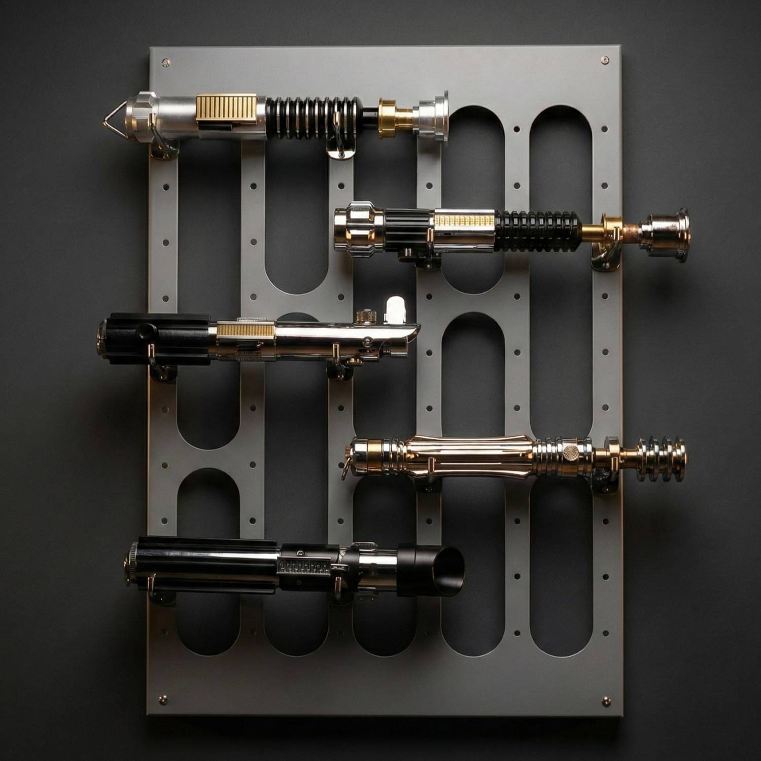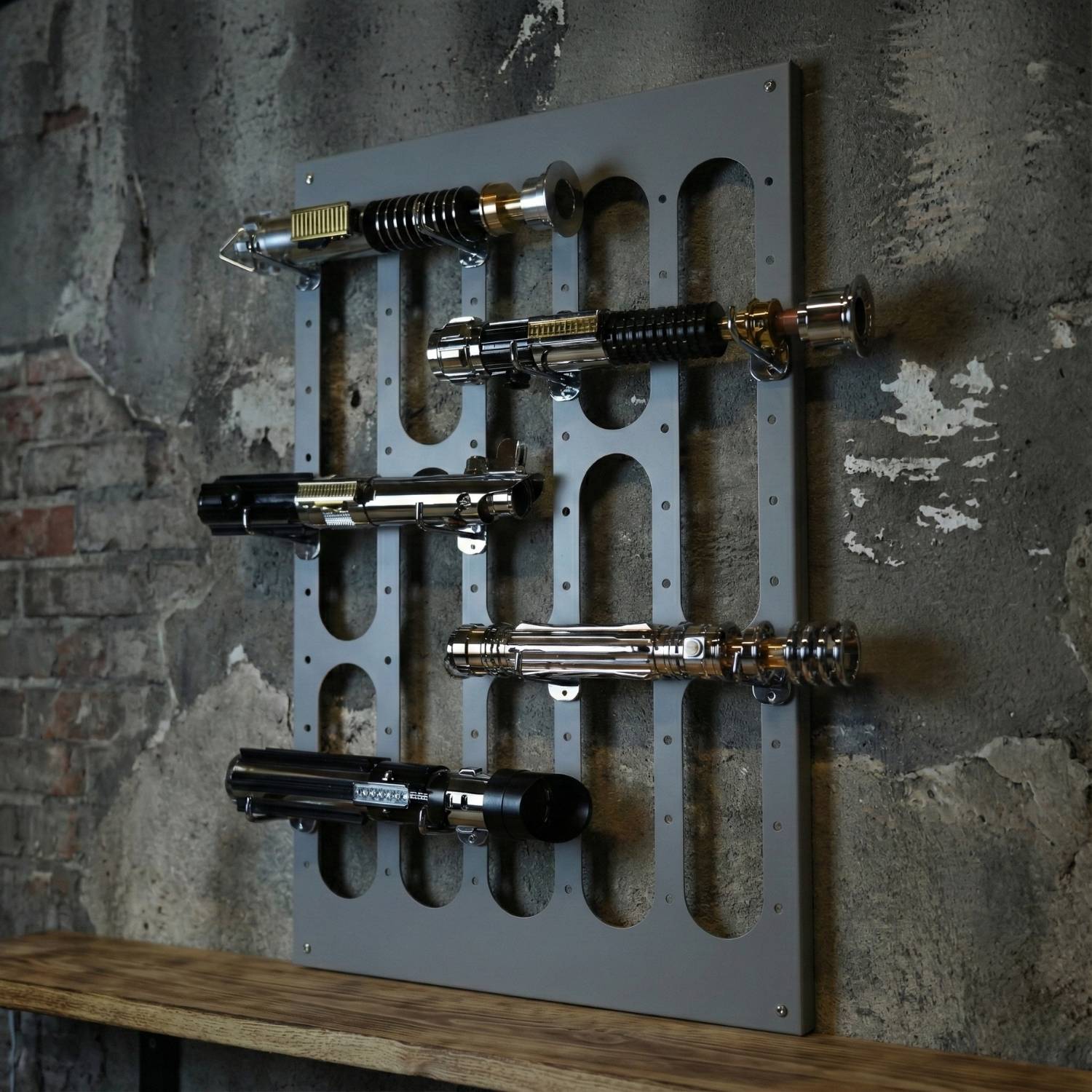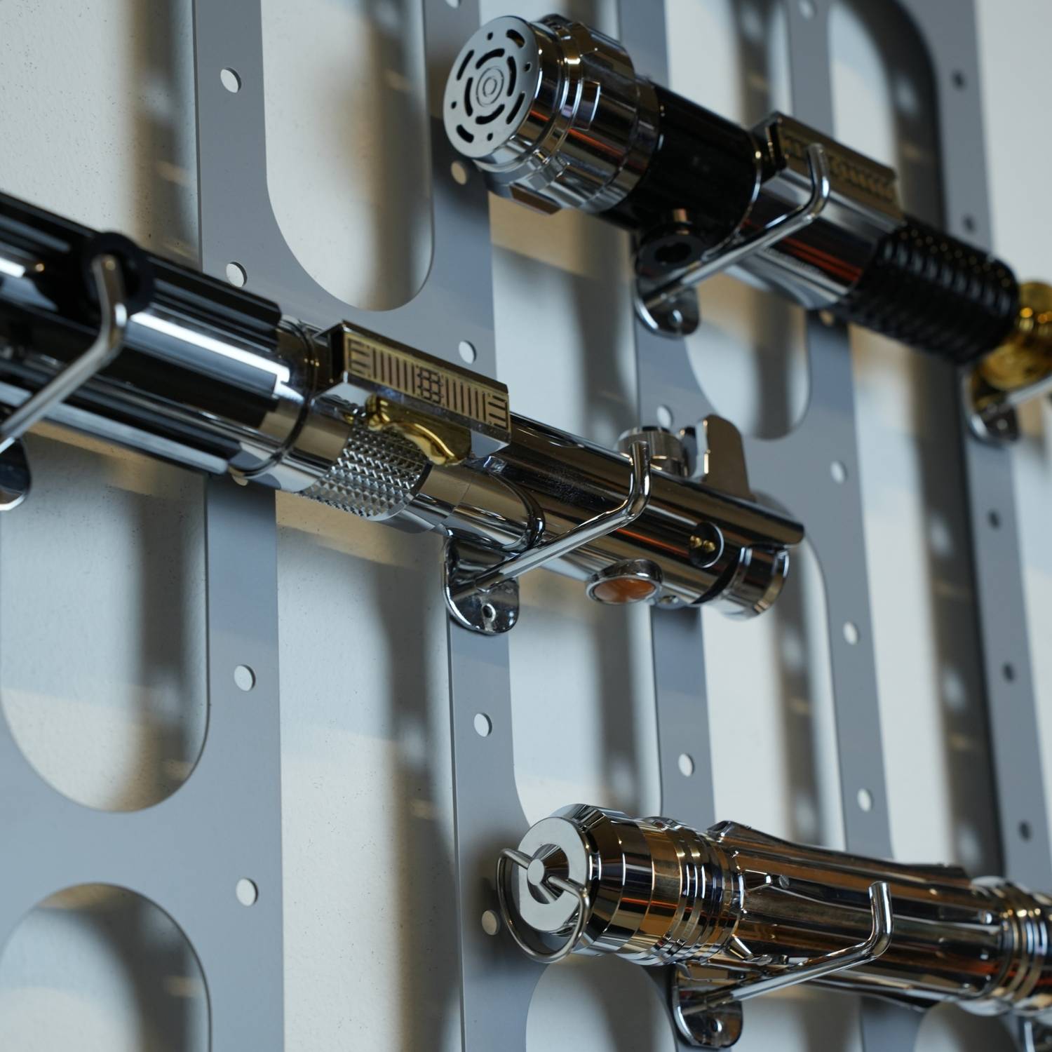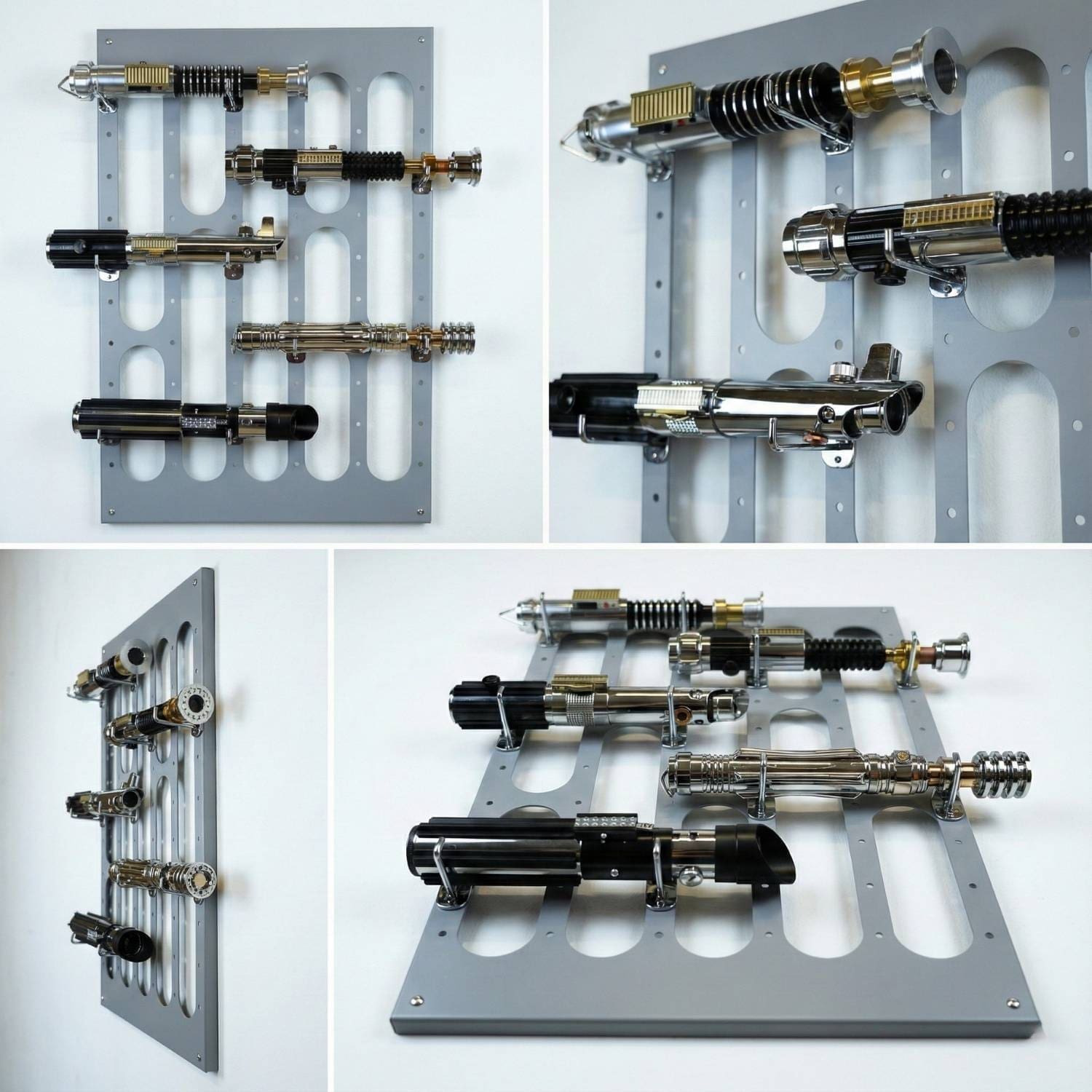 No more lightsabers gathering dust on the shelf. With the Swiss Sabers “Imperial Grid” wall mount, you can display your lightsaber collection the way it deserves!